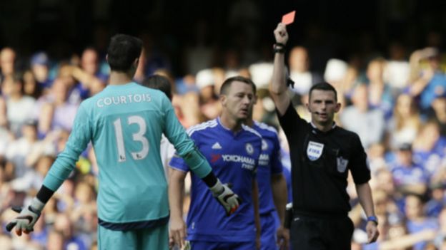 Kipa wa mpya wa ziada wa Chelsea Asmir Begovic alijipata uwanjani bila kupenda baada ya Courtois kuoneshwa kadi nyekundu kunako dakika ya 55 ya kipindi cha pili.